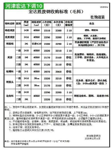 各供方:柳鋼股份:*.沖片類、剪切料*類、剪切料*類廢鋼價格下調**元/噸;*.冷壓餅類廢鋼價格下調**元/噸;*.其他料型廢鋼價格不變。以上價格從****年**月**日零時開始執行。