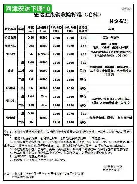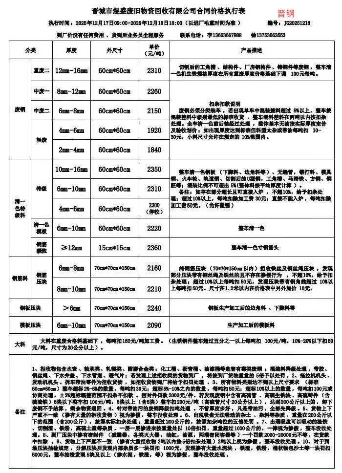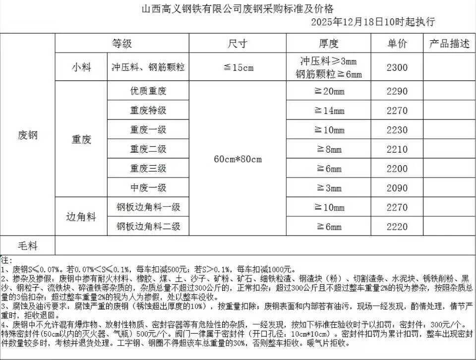 山西華鑫源鋼鐵集團通知:****年**月*日**時起,廢鋼各料型下調(diào)**執(zhí)行以下價格: