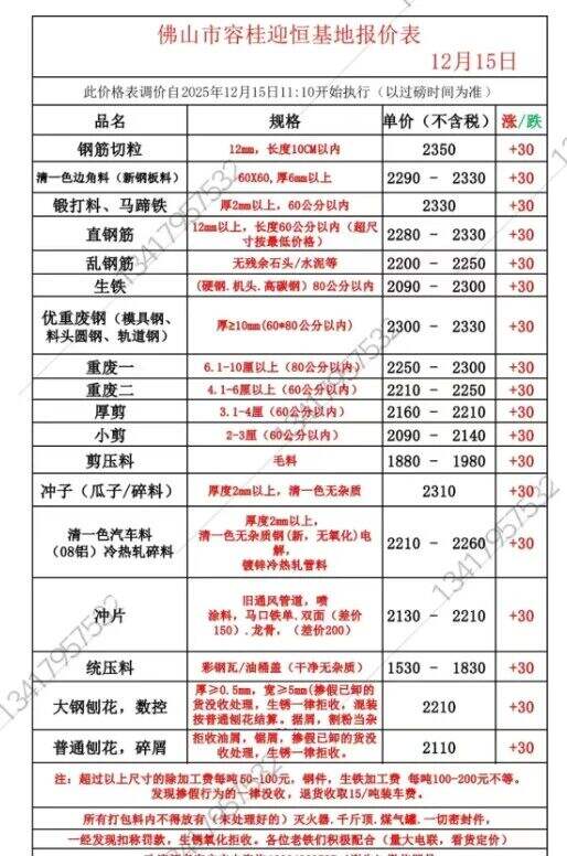 廣東欣貿(mào)基地廢鋼調(diào)價(jià)通知價(jià)差標(biāo)準(zhǔn)明細(xì)表不變。詳見(jiàn)價(jià)差明細(xì)表編號(hào):XMGD-**-**直采,場(chǎng)地所有料型統(tǒng)一上調(diào)**元,**點(diǎn)整執(zhí)行。(以上調(diào)價(jià)內(nèi)容僅針對(duì)廣東區(qū)域)****年**月**日。