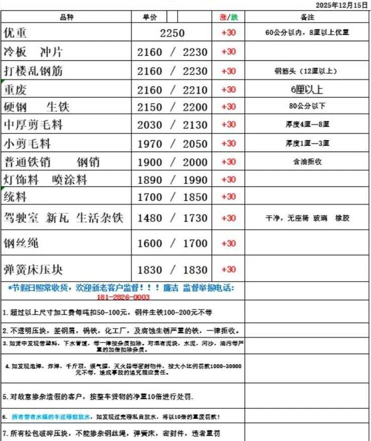 廣東欣貿(mào)基地廢鋼調(diào)價(jià)通知價(jià)差標(biāo)準(zhǔn)明細(xì)表不變。詳見(jiàn)價(jià)差明細(xì)表編號(hào):XMGD-**-**直采,場(chǎng)地所有料型統(tǒng)一上調(diào)**元,**點(diǎn)**分執(zhí)行。(以上調(diào)價(jià)內(nèi)容僅針對(duì)廣東區(qū)域)****年**月**日。