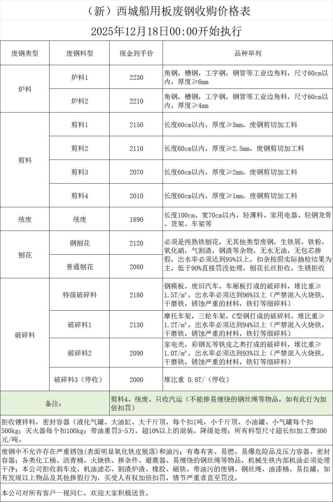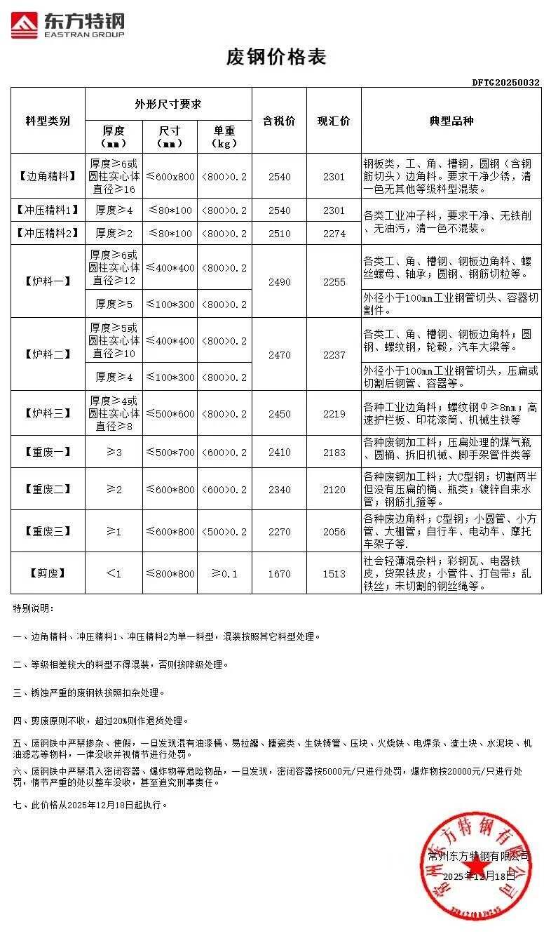 江蘇敬業基地計劃于****年**月**日**時起含稅價格:統一下調**元/噸。鋼板料(*mm)****元/噸,重廢一(**mm)****元/噸,重廢二(*mm)****元/噸,重廢三(*mm)****元/噸,次重廢(*mm)****元/噸,特級破碎料*類****元/噸。